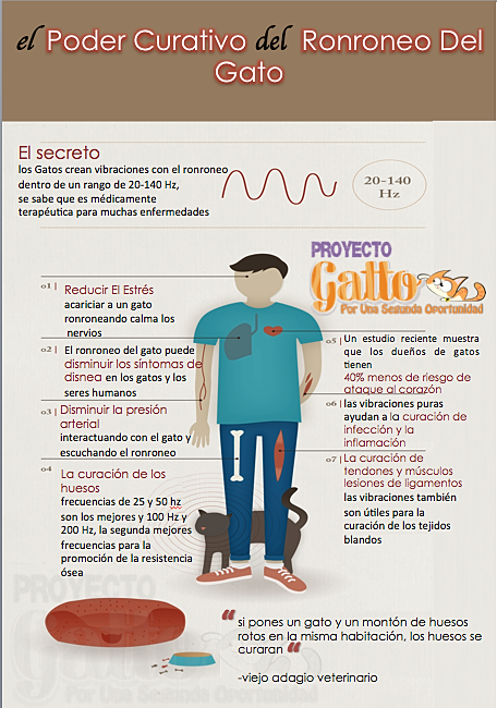 Los poderes curativos del ronroneo del gato se cree se deben a la frecuencia vibratoria del sonido que emiten, que llega hasta una vibración de hasta 50 hertz, que es la frecuencia a la que se ha comprobado requieren los huesos para sanar.
